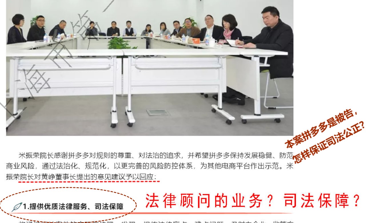 长宁法院与拼多多真的有合作吗? 两届合作组核心成员能主审拼多多案件吗? 【法院官方新闻(二)】 2022年11月3日下午,长宁法院党组书记、院长孙培江带队走访调研辖区知名电商企业上海寻梦信息技术有限公司【拼多多】。……商事(互联网)审判庭综合审判团队负责人邓X等参加调研,上海寻梦信息技术有限公司党委书记、高级副总裁王坚主持调研座谈会。 王坚副总裁对长宁法院此次点对点上门指导表示衷心感谢。…… 孙培江院长表示,……对未来工作,他提出三点希望: ……三是 要改进合作方法,……开展各项合作,…… 长期以来,长宁法院始终坚持开展对辖区企业的全面“体检”、上门“问诊”和专家“会诊”,创新推出了司法诊断报告制度,获得普遍好评。…… 【法院官方新闻(一)】 2018年3月2日,长宁法院党组书记、院长米振荣,……互联网审判庭、研究室负责人(注:本案一审审判长邓X)等一行,赴互联网企业拼多多调研。 ……拼多多董事长黄峥谈到,……其在创立与发展阶段也需要有关部门在多方面予以支持。 ……米振荣院长对黄峥董事长……予以回应:1.提供优质法律服务、司法保障,2.对互联网平台法治化难点问题予以研讨。||| 像不像法律顾问? ……翁华建副区长对长宁法院服务保障区域经济发展大局工作表示感谢,……翁华建副区长同时表示,区政府会在互联网审判庭资金、技术、研讨等方面全力做好支持保障。 (2023)沪0105民初34997号 【本案审理表现】 1. 玩穿越——举证通知剖腹看(相信你从没听说过):长宁法官提前5天发送没有出生的举证通知给被告拼多多。 长宁法院2023年11月21日制作的《举证通知书》:其他当事人21日收到;拼多多提前5天在16日就收到了! 2. 举证期限平等吗? 《笔录1》第3页, 审:根据民诉法相关规定,本次证据交换之后,如果各方在举证期限届满后当事人再逾期举证的,法庭将分情况处理,……(“再”——此次拼多多逾期)……今天法庭另行给予各方15天的举证质证期。 原:是被告证据逾期才导致我方要补充举证的,不同意给予15天举证质证期。 审:举证期限对于当事人都平等的。 3. 法官在拼多多连带责任问题有倾向性诱导式提问? 《音频转换文字记录2》第28页, 法官:“被告2,现在直播间是关闭的对吧?什么时候关闭的。” 笔录根本看不出:《笔录2》第12页,审:被告2,现在直播间是否关闭? 4. 拼多多代理人无合法身份、为何能参与庭审? 《笔录3》原告要求查看对方证件和委托手续材料。 审:被告代理人的证件及委托手续均在卷宗中。 原:要求查看委托书、律所函、授权委托书和劳动合同的原件。 …… 被2代:庭前已经上传至法院系统,今天未携带原件。 原:被告2代理人无法提供相应材料,应该下庭,不应参加本次庭审。 审:告知原告,你方可以提出异议,法院会对代理人的代理资质进行审查。 结案后原告阅卷(一审电子卷宗)并未查到代理人资料,后来查阅上海一中院再审卷宗【(2024)沪01民申350号】发现,代理人授权委托书是伪造的,代理人员工身份证据是假的。 5. 长宁法官故意采信拼多多非法证据? 拼多多提交的六组证据无一组合法(无单位负责人及制作证明材料的人员签名或者盖章,并加盖单位印章),违反《民事诉讼法解释》第115条。